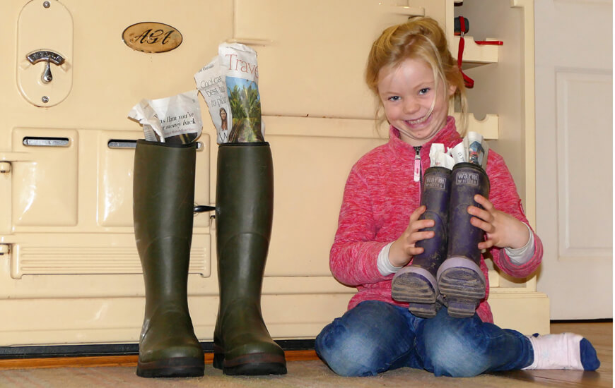 When we were kids, we used to love walking into ponds and rivers, wading in as far as possible daring to see how far we could go without getting waterlogged wellies. I’m sure you and your kids have all done this, too. Needless to say, the water pours over the tops and our feet get wet. ‘When I was a lad, ’ all we needed was a towel to dry the wellies out. But that was in the days before neoprene-lined wellies. As you’ll know, neoprene-lined wellies take longer to dry out. Our wellies have 4mm of neoprene lining – great for insulation but it makes them harder to dry out.
