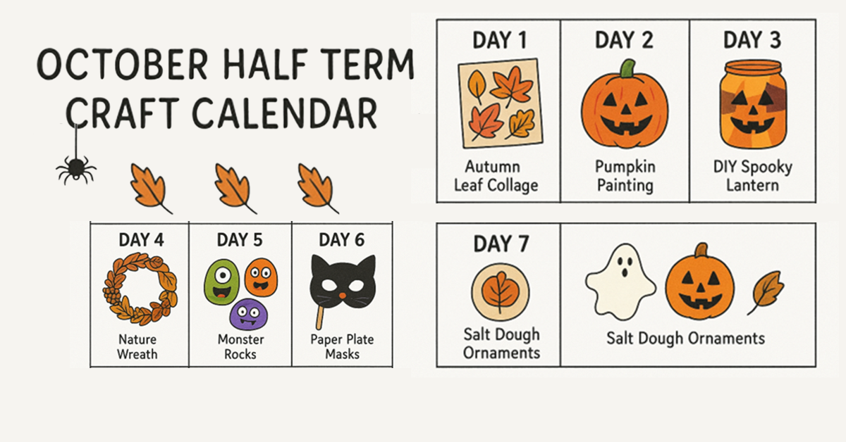 Here’s a 7-day October half-term crafting plan that balances indoor, outdoor, and Halloween-themed activities. All are kid-friendly with simple materials you can find around the house or garden. There's one activity per day, with an easy materials list, so you don’t have to think on the spot.