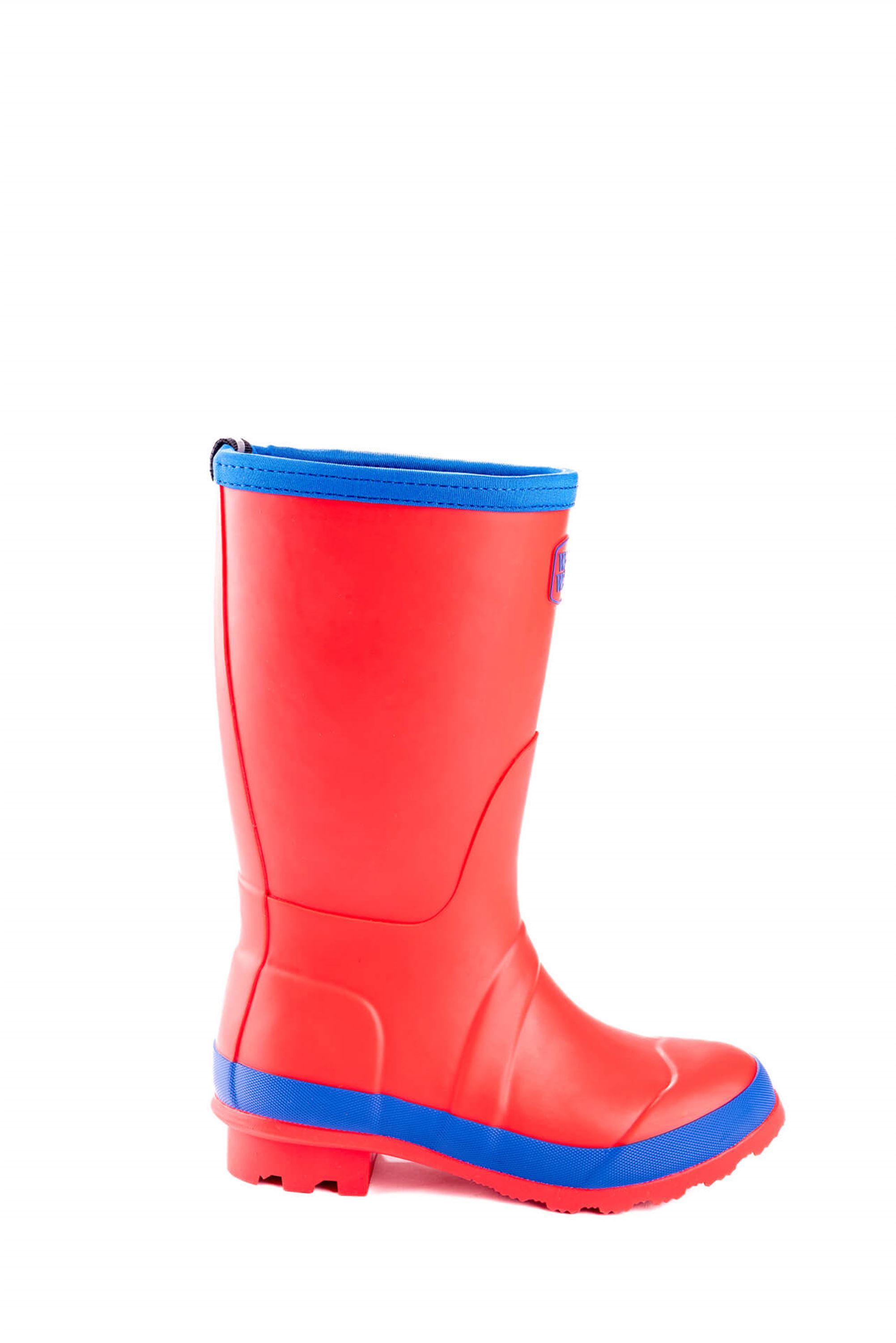 Red infant wellies, handmade from natural rubber and lined with 4mm neoprene to keep your child's feet warm and keep the cold out! Tops are hand-stitched with lycra edging tape for a neat finish. They also feature handy reflective pull-on/hanging loops. These wellies were designed in Cumbria and are made exclusively for The Warm Welly Company. #warmwellies